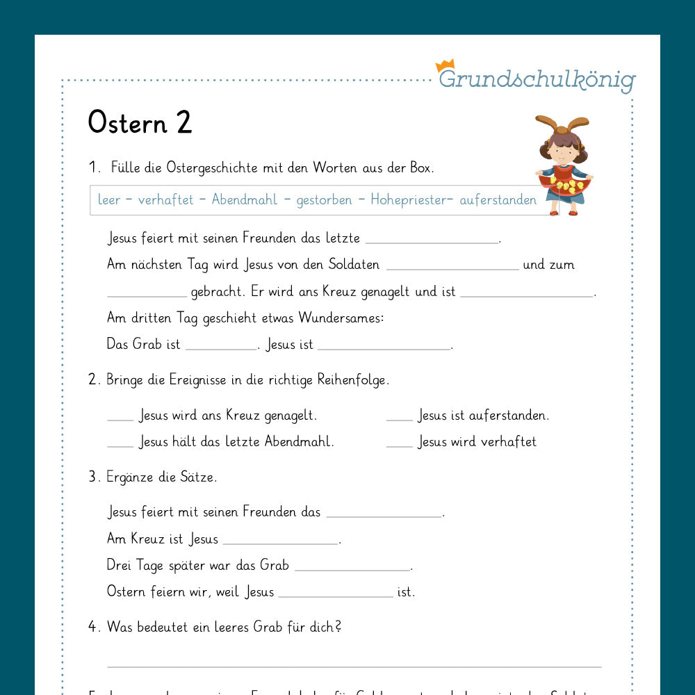 Alle Arbeitsblätter zum Thema Ostern für das Fach Religionslehre zum einfachen Herunterladen und Ausdrucken als PDF. Im Paket ist auch ein Test enthalten. Mit dem Test könnt Ihr Euer Wissen überprüfen und wisst danach genau, wo Ihr steht.