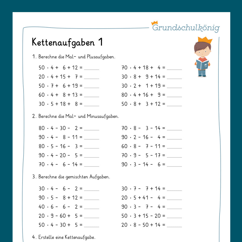 Alle Arbeitsblätter vom Grundschulkönig zum Thema Kettenaufgaben zum gesamten Download als ein PDF.