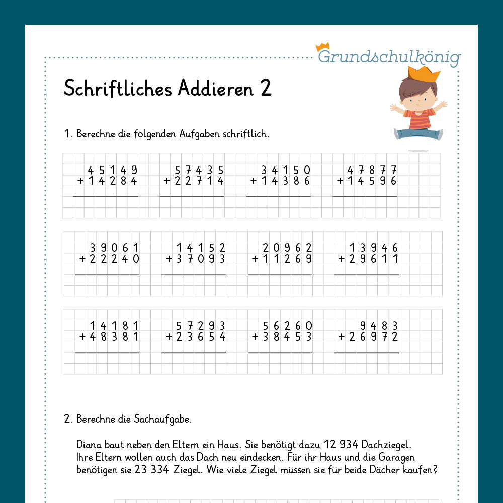 Alle Arbeitsblätter vom Grundschulkönig zum Thema Schriftliches Addieren im Zahlenraum 100 000 zum gesamten Download als ein PDF.