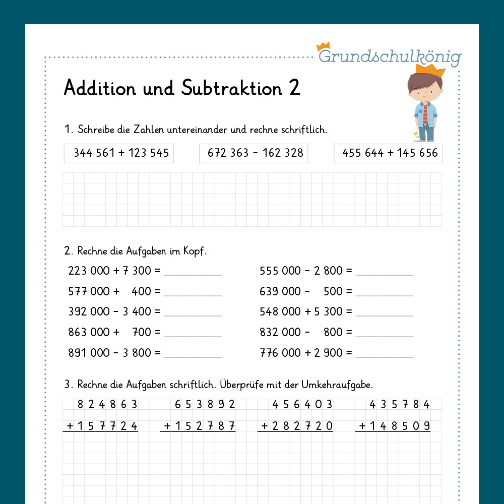 Alle Arbeitsblätter vom Grundschulkönig zum Thema Addition und Subtraktion im Zahlenraum 1 000 000 zum gesamten Download als ein PDF.