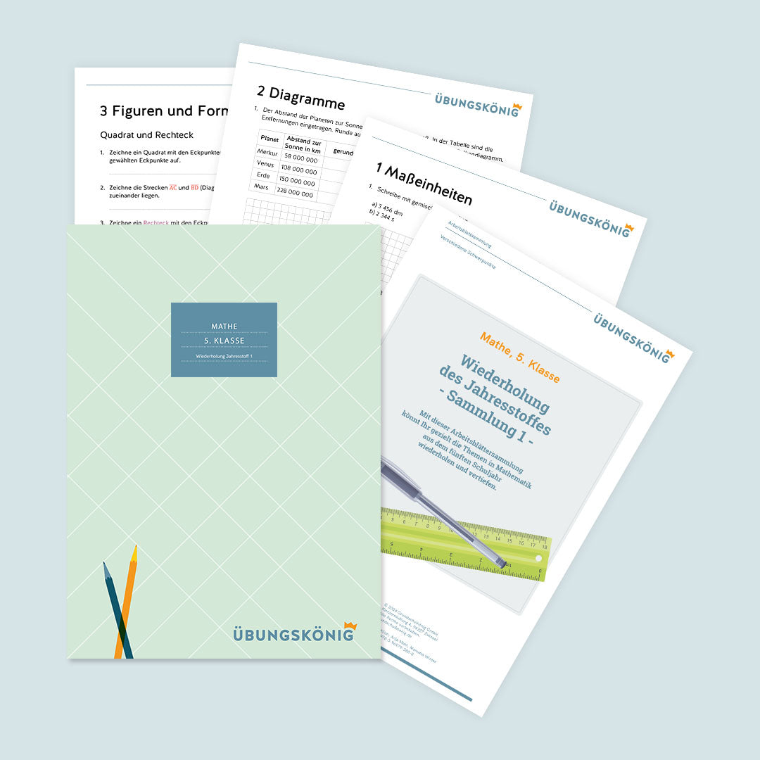 Unser Tipp: Zur eingehenderen Wiederholung einzelner Themen könnt ihr die Arbeitsblätter in den verschiedenen Themenbereichen in Mathematik der 5. Klasse nutzen.